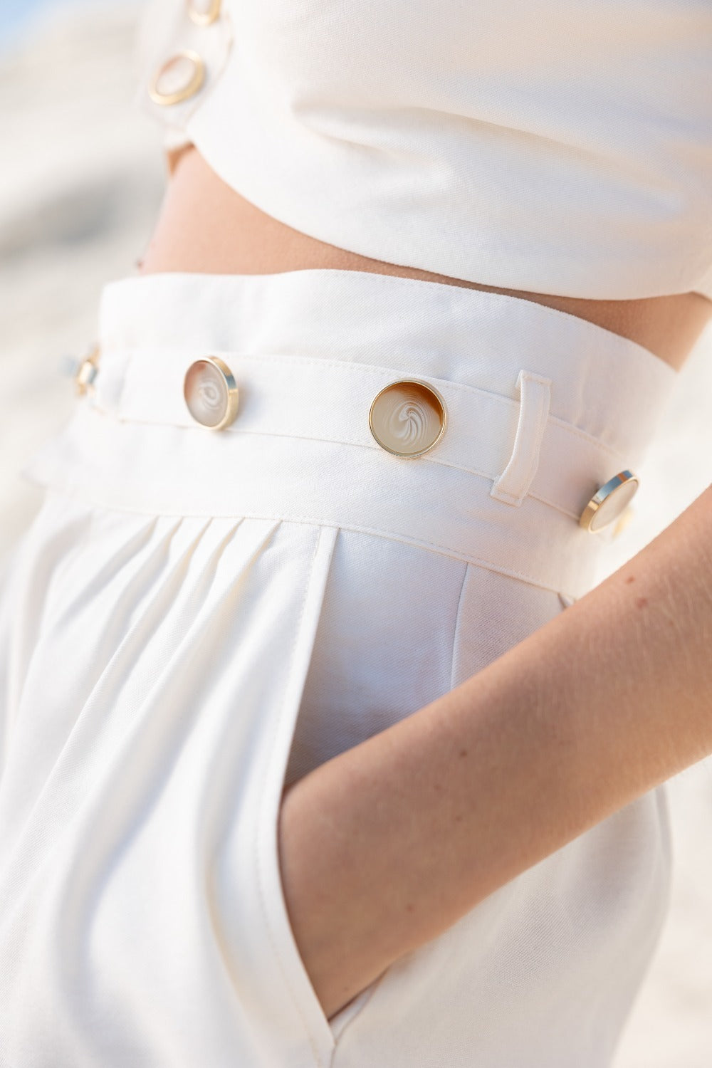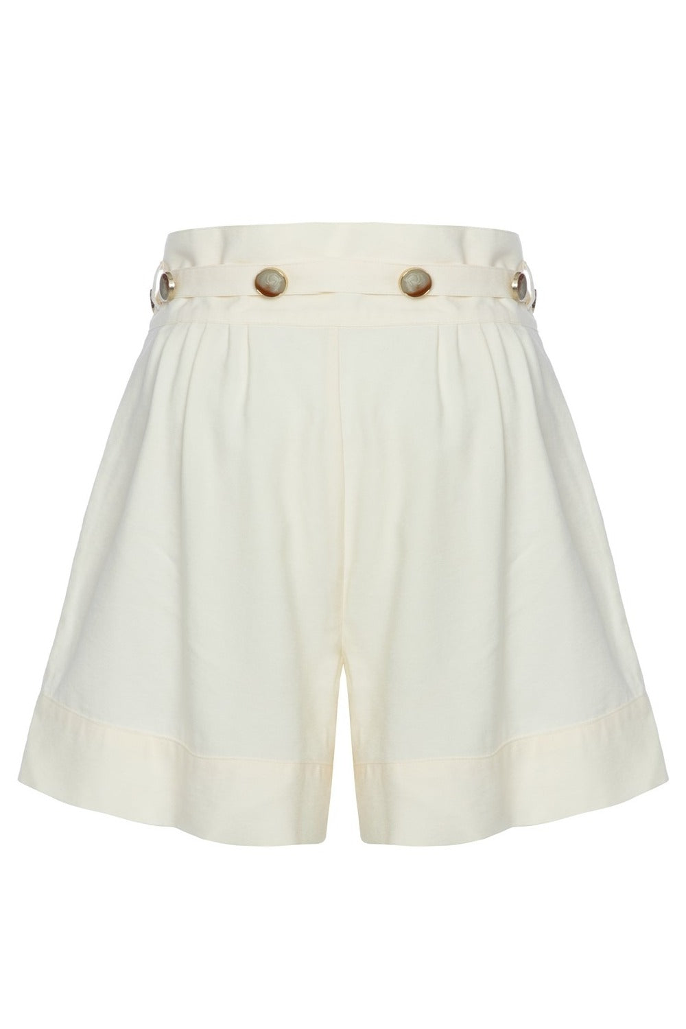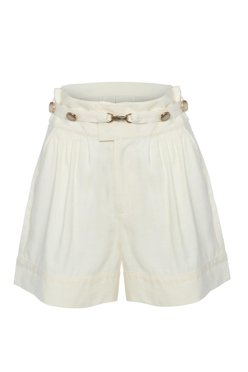 Yüksek Bel, Aksesuarlı Kemer Detaylı, Pileli Ekru Şort