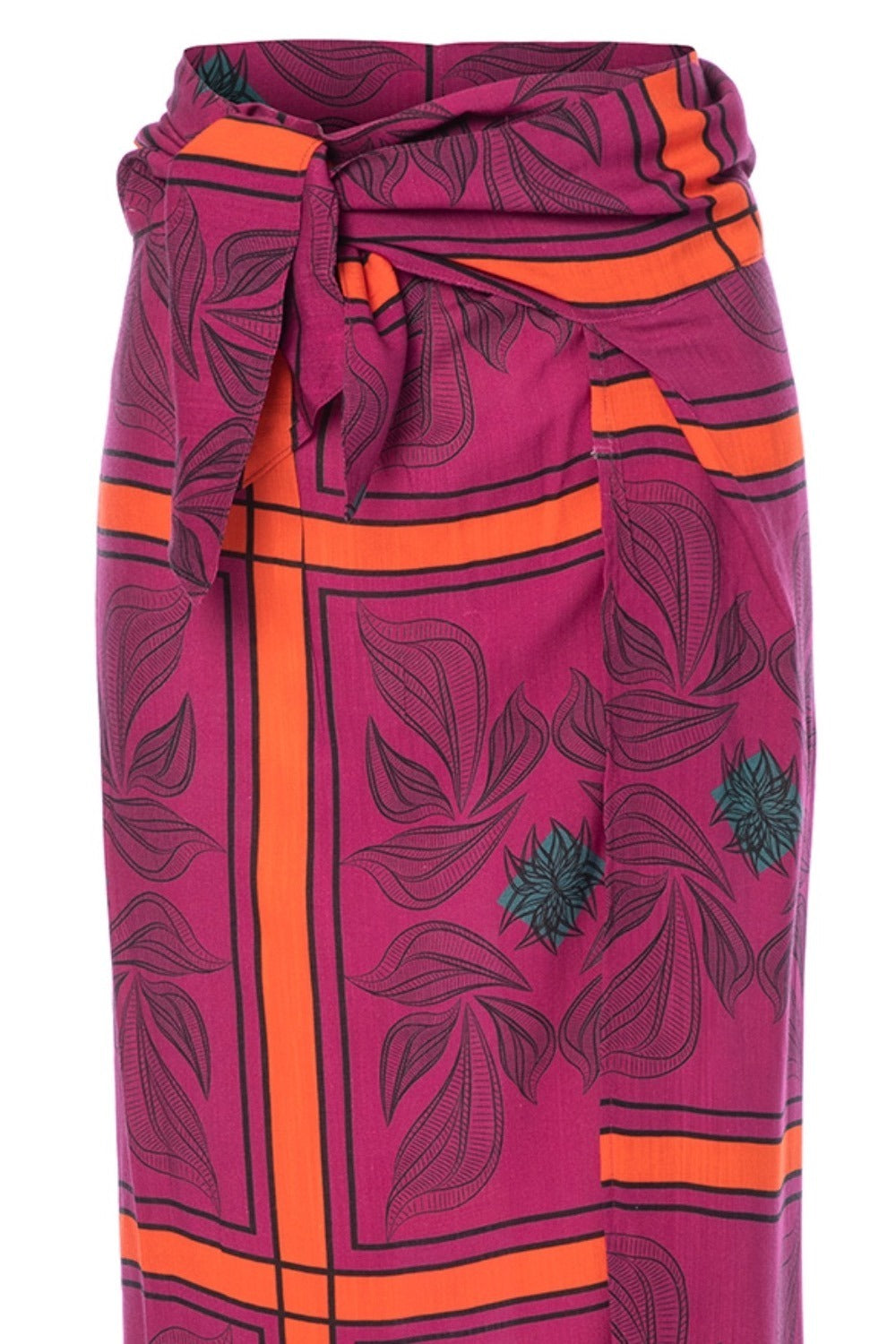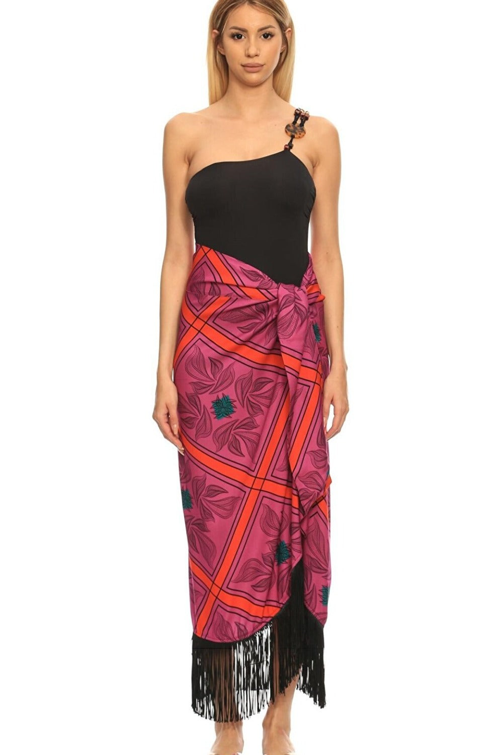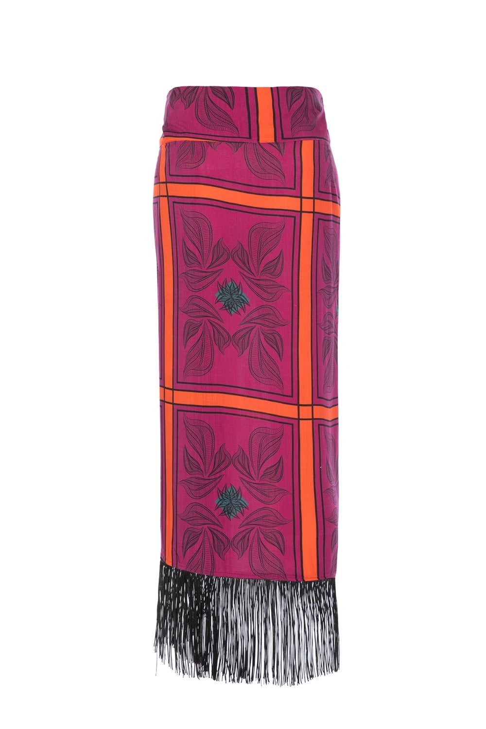 Balia Siyah Saçaklı, Renkli Tasarım Desenli, Midi Yırtmaçlı Pareo Etek