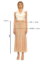 Hermosa uzun, dekoratif düğmeli detaylı, önden yırtmaçlı, orta bel, saten-şifon etek. Bu ürün 36, 38, 40 beden üretilmiştir. Arka belde lastik detayı olduğu için kolaylıkla bedene uyum sağlar. Ölçü detayları için ilgili bölüme bakabilirsiniz. Ürün astarlıdır, iç göstermez. Yanda gizli fermuarı mevcuttur. Ürün tatlı şampanya rengindedir. Ürünü kolaylıkla Women & Women koleksiyonuna ait diğer parçalarla ya da basic gardrop parçalarıyla kombinleyebilirsiniz. Ürün bütünüyle lüks ve ince tasarım detayları içermektedir. Şık plaj davetlerinde ya da günlük şık görünüm için de tercih edebilirsiniz.