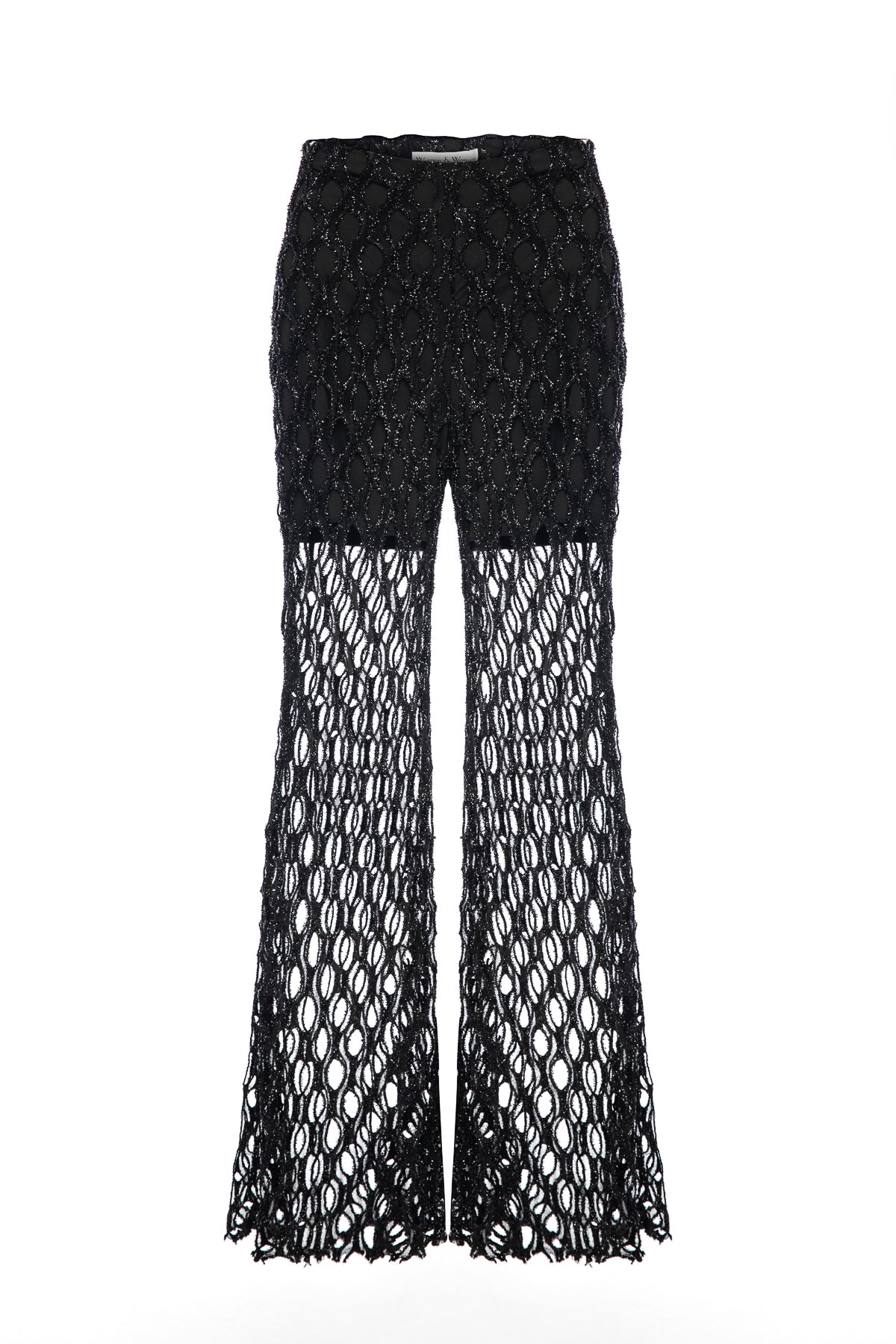 Siyah ispanyol paça, dekoratif dantel, parıltılı kumaş detaylı, astarlı pantolon. İç göstermez.  Yanda gizli fermuarı vardır. Bu ürün 34, 36, 38, 40 beden olarak üretilmiştir. Ölçü detayları için ilgili bölüme bakabilirsiniz. Ürünü kolaylıkla Women & Women koleksiyonuna ait diğer ürünlerle kombinleyebilirsiniz. Ürün bütünüyle lüks ve ince tasarım detayları içermektedir. Şık plaj davetlerinde ya da akşam şık görünüm için de tercih edebilirsiniz.