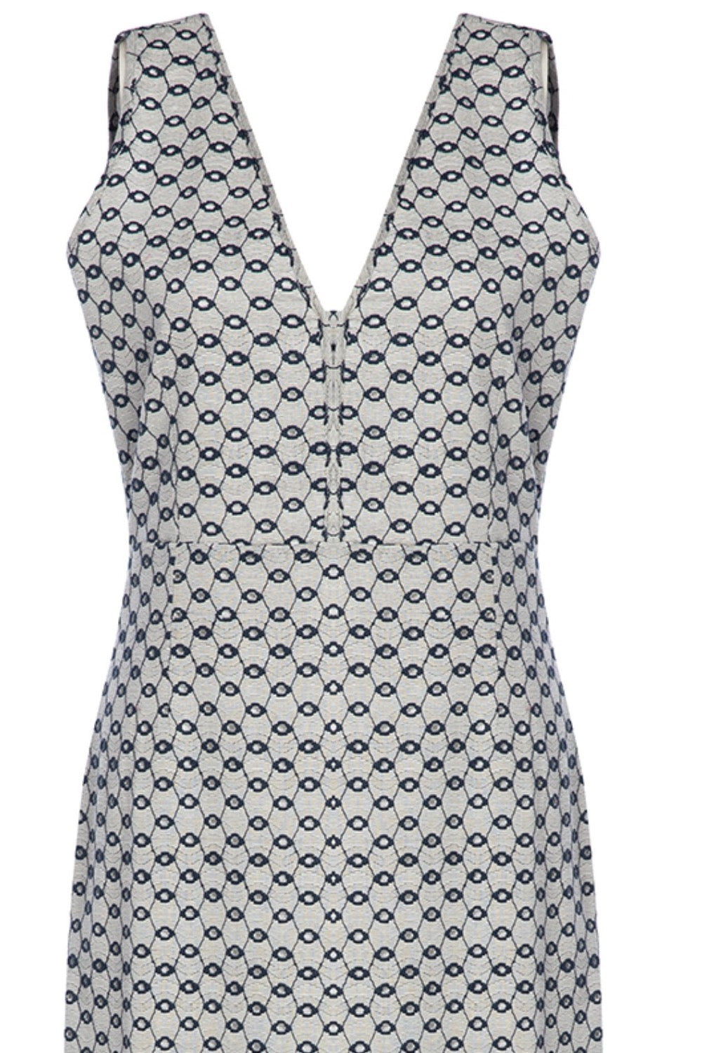 Eden lacivert, marin detaylı, jakarlı - desenli, v yaka, örme elbise. Arka ortada gizli fermuar vardır. Marin desenli pamuk karışımlı jakarlı kumaş kullanılmıştır. Yanları yırtmaçlı ve astarlı elbisedir, iç göstermez. Ürün bütünüyle lüks ve ince tasarım detayları içermektedir. Şık plaj davetlerinde ya da günlük şık görünüm için de tercih edebilirsiniz. Ürün 36, 38, 40 beden olarak üretilmiştir. Ürünün ölçü detayları için ilgili bölüme bakabilirsiniz.
