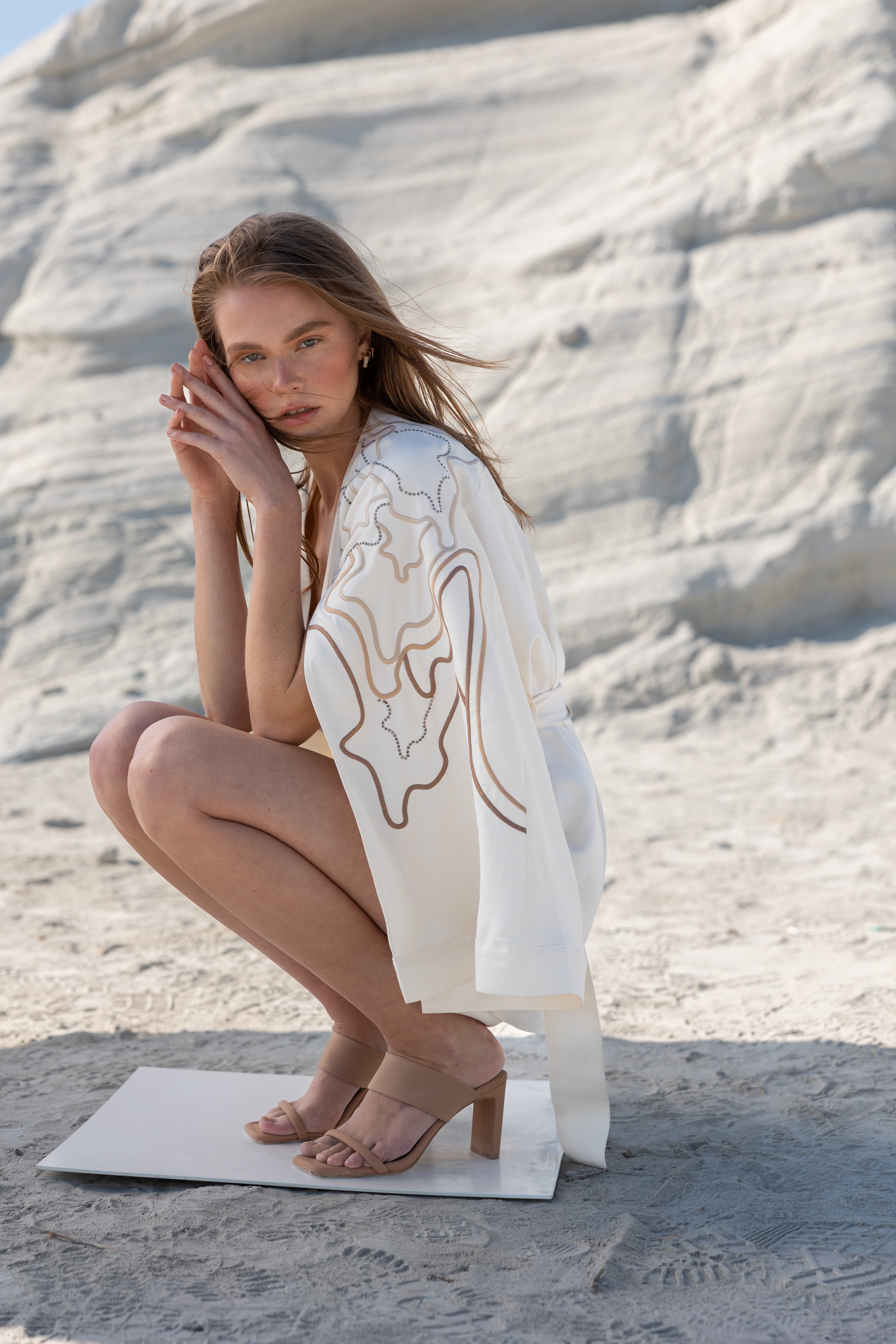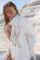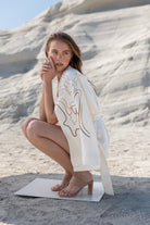 Arka yaka ve kol boyu özel tasarım, naturel tonlarındaki nakış desenli ve antrasit renkteki parlak taş baskılı kimono. Klasik Japon kimono kalıbından esinlenilerek daha modern bir tasarımla yorumlanmıştır. Ön kol üzerinde yırtmaç detayı vardır. Kimono boyu diğer Women & Women kimono modellerine göre daha kısadır. Kumaş rengi 'Eggshell'dir. Ürün bütünüyle lüks ve ince tasarım detayları içermektedir. Şık plaj davetlerinde ya da günlük şık görünüm için de tercih edebilirsiniz. Ürün standart beden olarak üretilmiştir. Ürünün ölçü detayları için ilgili bölüme bakabilirsiniz. Ürünü kolaylıkla Women & Women koleksiyonuna ait diğer parçalarla ya da basic gardrop parçalarıyla kombinleyebilirsiniz.