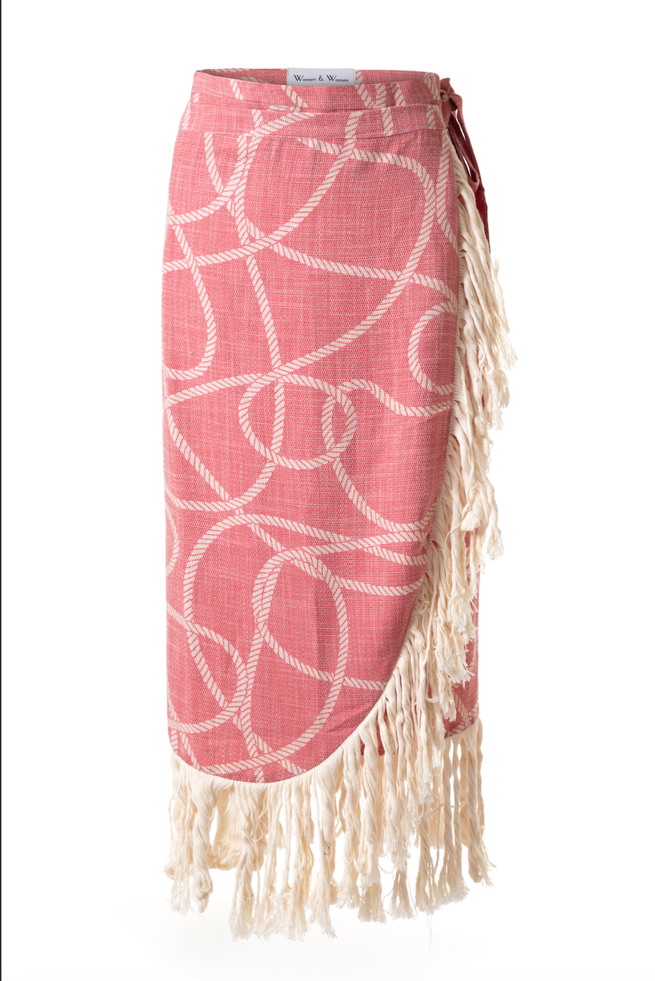 Kırmızı marin halat desenli, dökümlü viskon kumaş ile, kruvaze kalıptan tasarlanmış, etek ucunda ise krem rengi uzun saçak detayları olan, bel bağcıklı pareo etek. Bu model standart beden olarak üretilmiştir.