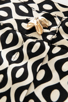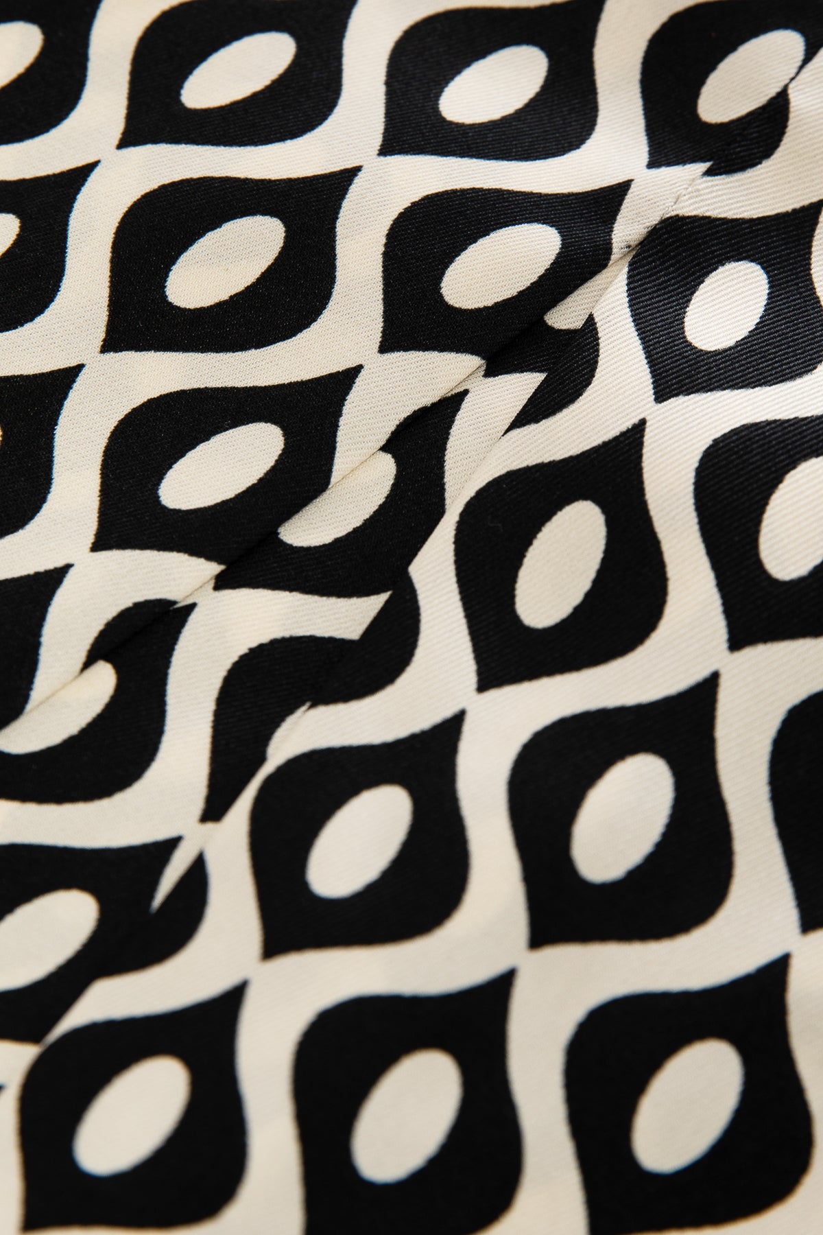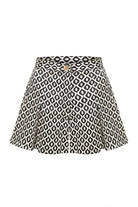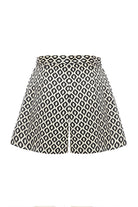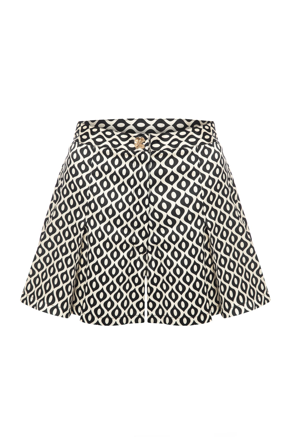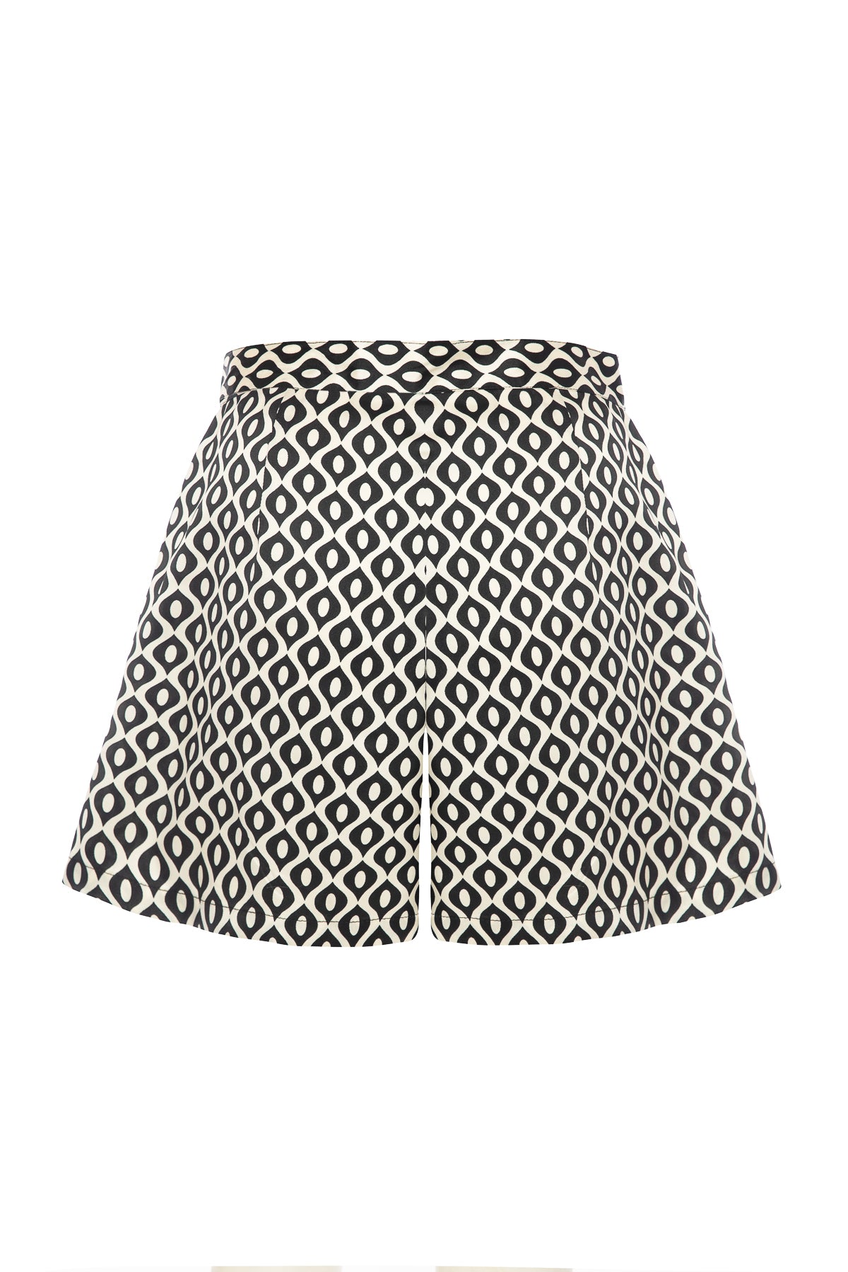Krem zemin üzerine siyah geometrik desen baskılı, A pile detaylı, altın sarısı düğmeli tasarım şort.