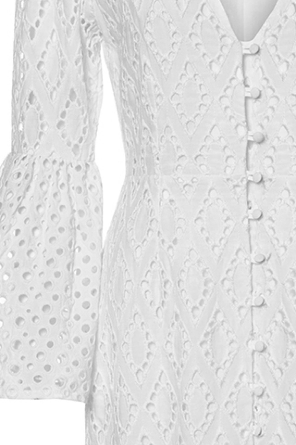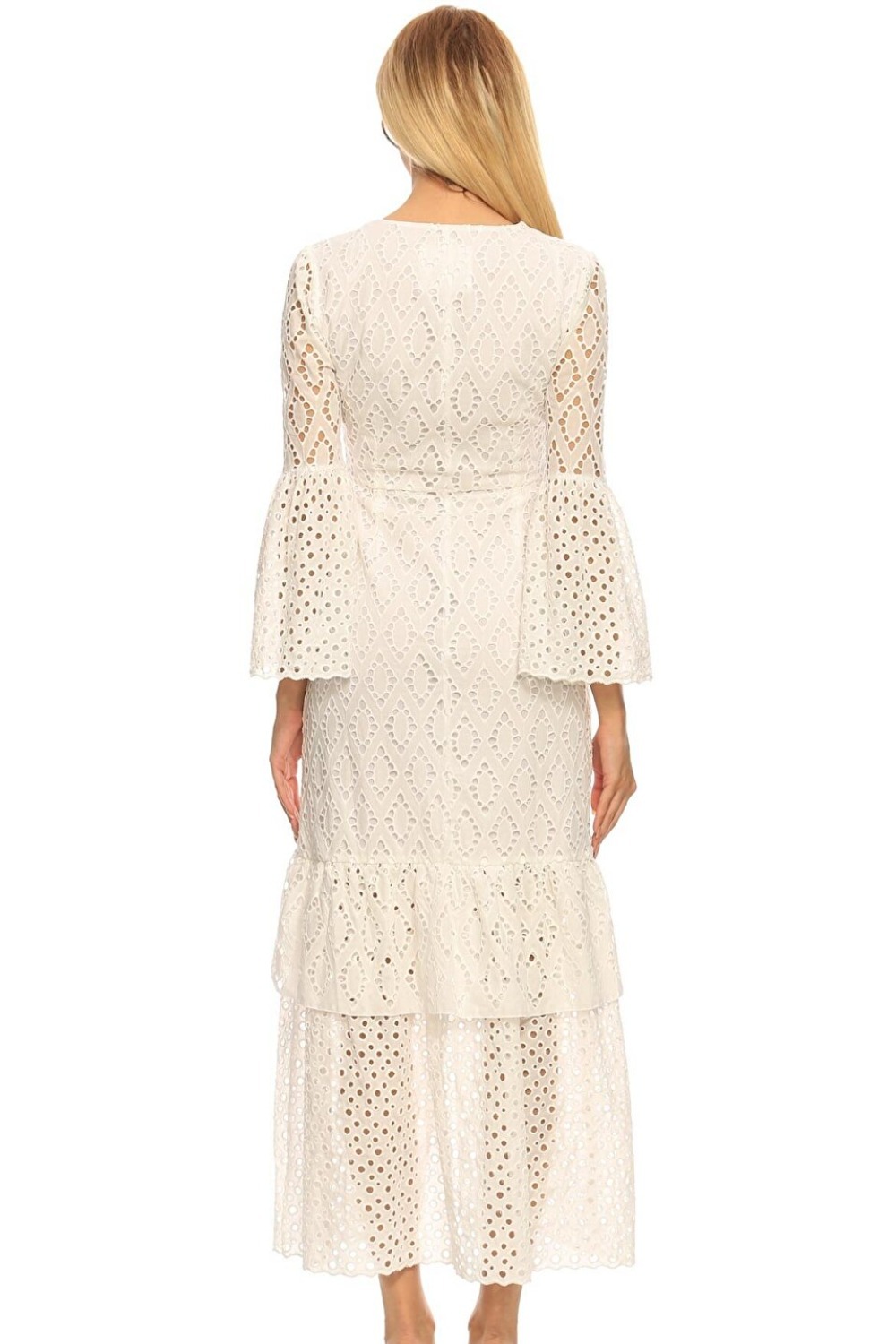 Long white designer dress with embroidery brode detail. Self fabric button closure. front slit. Lined, Fabric Information %60 cotton, %40 polyester. Line garment %100 cotton. Product size: 36 size.