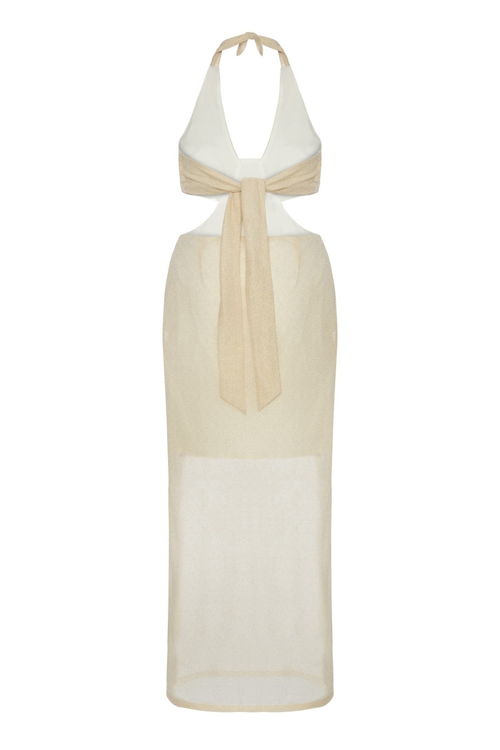 Cut-out detaylı, altın sarısı ışıltılı, yan yırtmaç detaylı, uzun elbise. Astar rengi, altıns arısı kumaş detaylarını ortay açıkarması için daha koyu renkte seçilmiştir. Arkada göğüste ve boyunda bağcık detyalıdır ve beden göre kolaylıkla ayarlanabilir. Etekte yanda gizli fermuar detaı vardır. Astarlı olduğu için iç göstermez. Bu elbise 34, 36, 38, 40 beden olarak üretilmiştir. Ürün bütünüyle lüks ve ince tasarım detayları içermektedir. Şık plaj davetlerinde ya da günlük şık görünüm için de tercih edebilirsiniz. Ürünün ölçü detayları için ilgili bölüme bakabilirsiniz.
